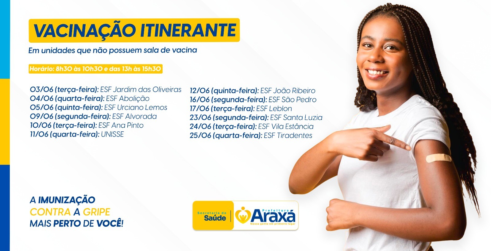 A Secretaria Municipal de Saúde inicia nesta terça-feira (3) a vacinação itinerante contra a gripe nas unidades de Estratégia Saúde da Família (ESF’s) que não possuem sala de vacinação. A vacinação será realizada em dias e locais previamente definidos, sempre nos horários das 8h30 às 10h30 e das 13h às 15h30.