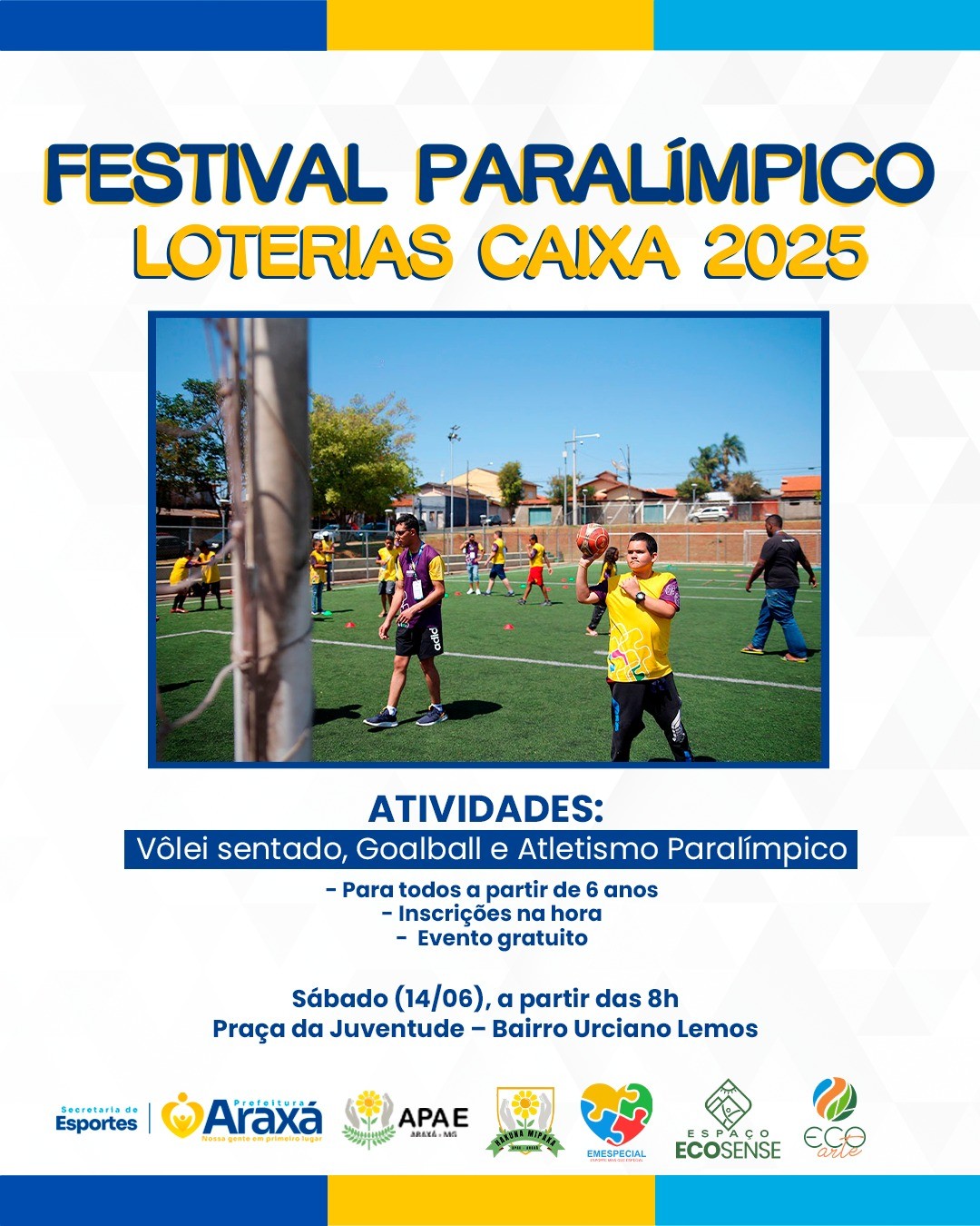 Onde o esporte inspira, inclui e transforma vidas! Araxá será palco da primeira edição do Festival Paralímpico Loterias Caixa 2025 neste sábado (14). O evento promovido pelo Comitê Paralímpico Brasileiro (CPB) tem o objetivo de fomentar o esporte e a inclusão social. A programação tem início às 8h, na Praça da Juventude, localizada no bairro Urciano Lemos.