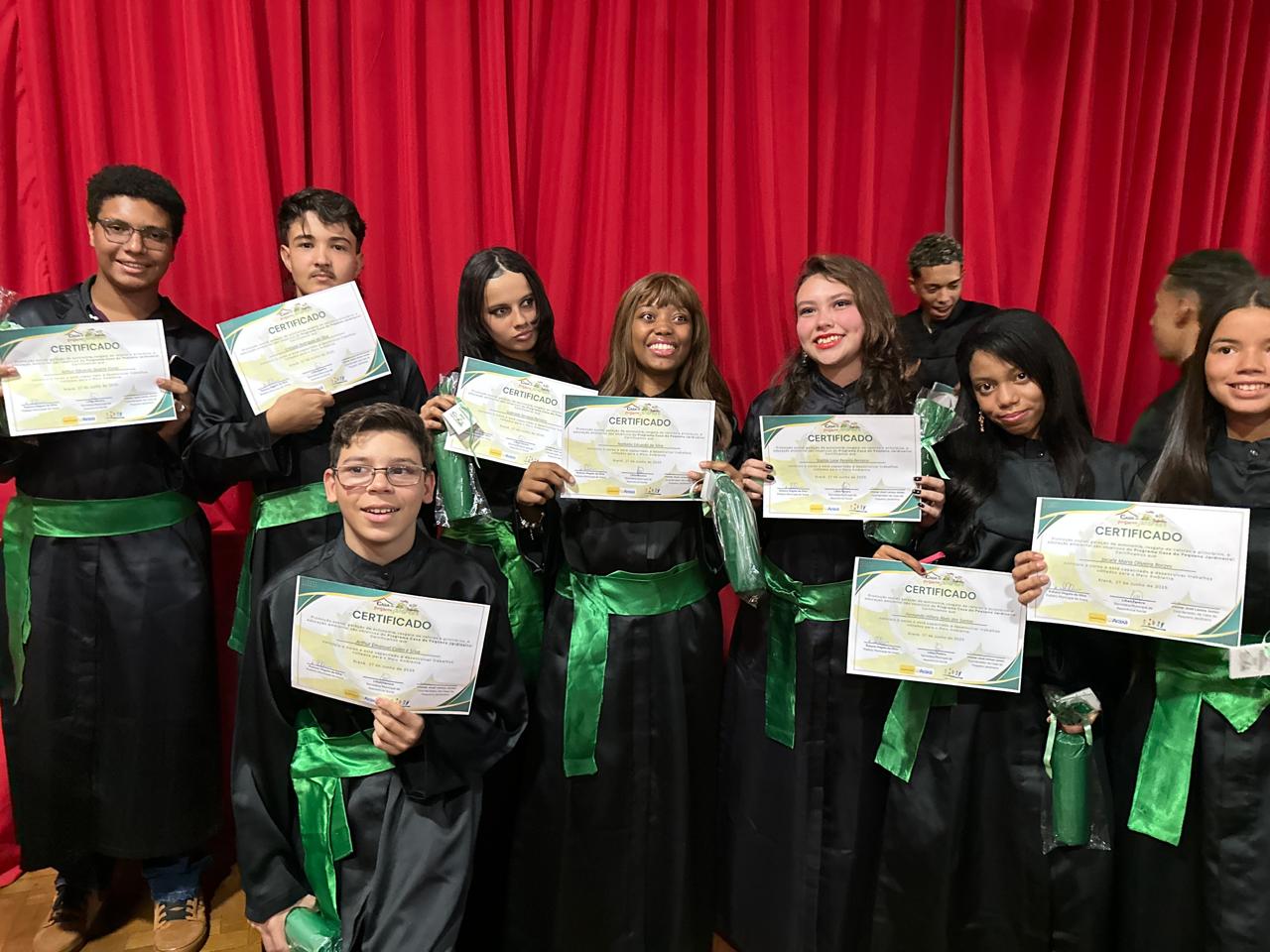 A formatura aconteceu no Colégio Dom Bosco e, além dos jovens e familiares, contou com a presença da secretária de Educação, Zulma Moreira; da subsecretária de Educação, Leany Tupinambá; do coordenador do projeto, Vismar José Lemos Júnior; e do vereador João Paulo da Filomena, representando a Câmara Municipal.