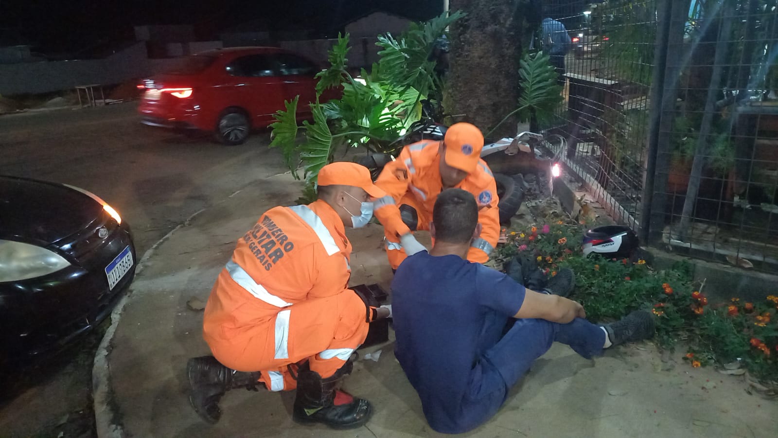 Ao chegarem ao local, os bombeiros encontraram o condutor da motocicleta C.D.C de 40 anos de idade caído ao solo. Ele estava consciente, orientado e com sinais vitais estáveis, apresentando um ferimento corte contuso no punho esquerdo.