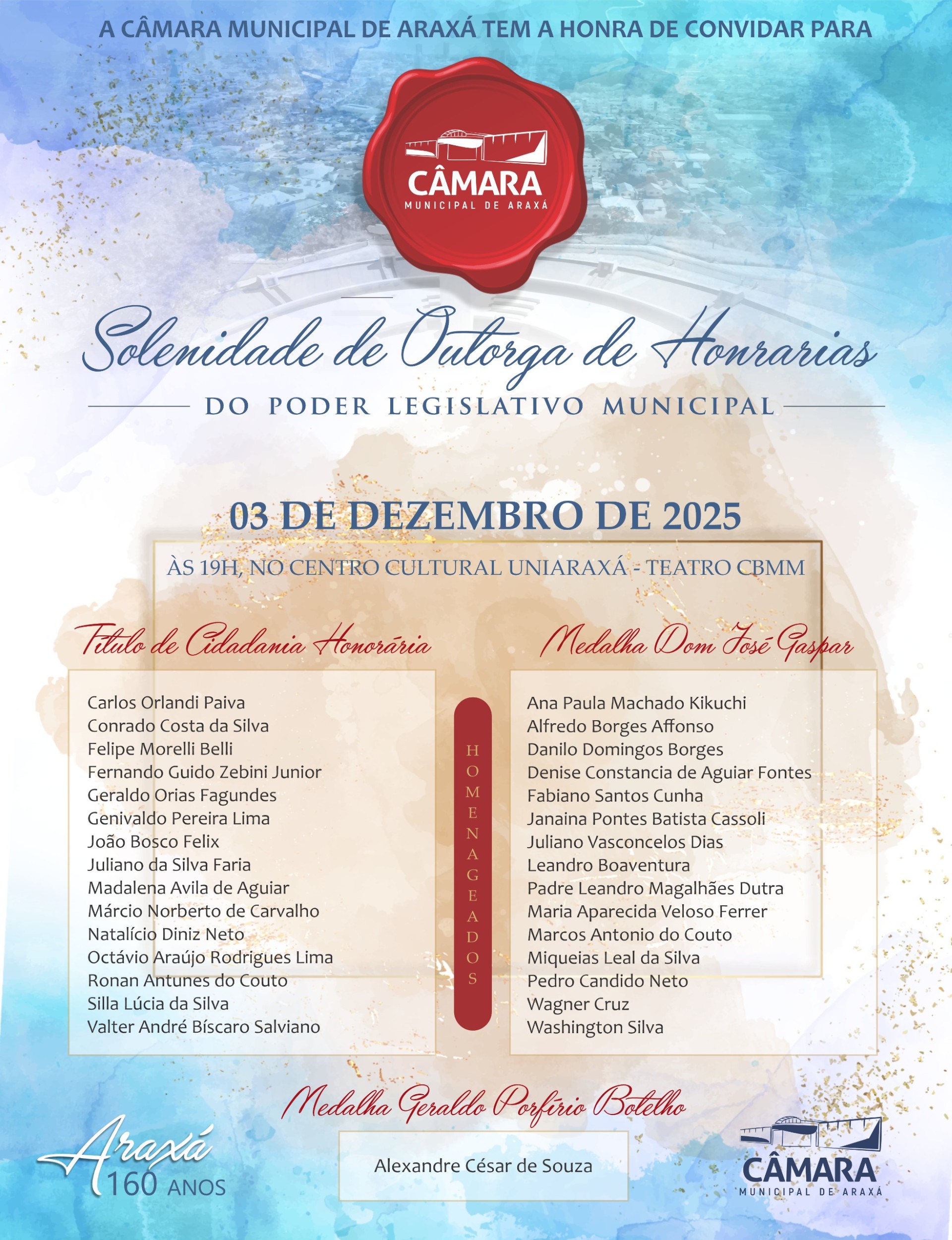 A Câmara Municipal de Araxá realizará mais uma solenidade para a entrega de honrarias no dia 3 de dezembro de 2025. O evento ocorrerá no Teatro CBMM e homenageará personalidades que se destacam na cidade de Araxá, com a outorga da Medalha Dom José Gaspar, do Título de Cidadania Honorária e da Medalha Geraldo Porfírio Botelho, que será entregue pela Associação da Imprensa Araxaense (AIA).