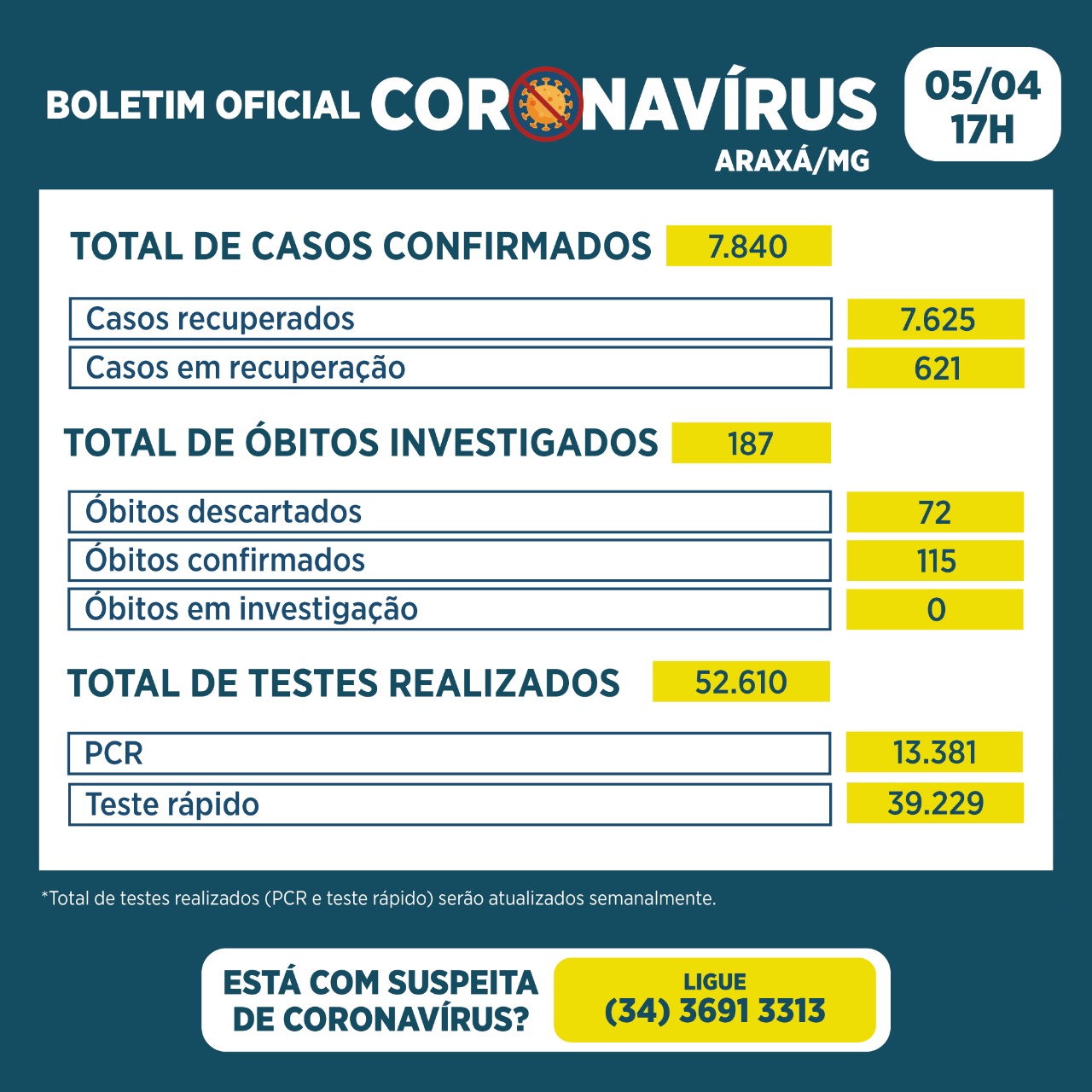 A Secretaria Municipal de Saúde informa que foram registrados quatro óbitos desde o último Boletim Epidemiológico divulgado no dia 1º de abril. Tratam-se de três mulheres (55, 58 e 66 anos) e um homem (41 anos).