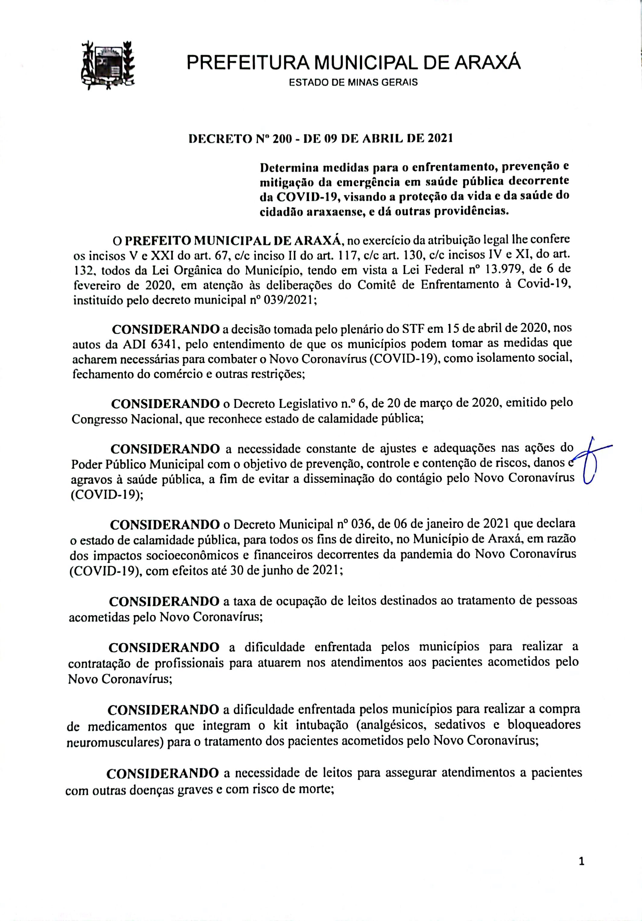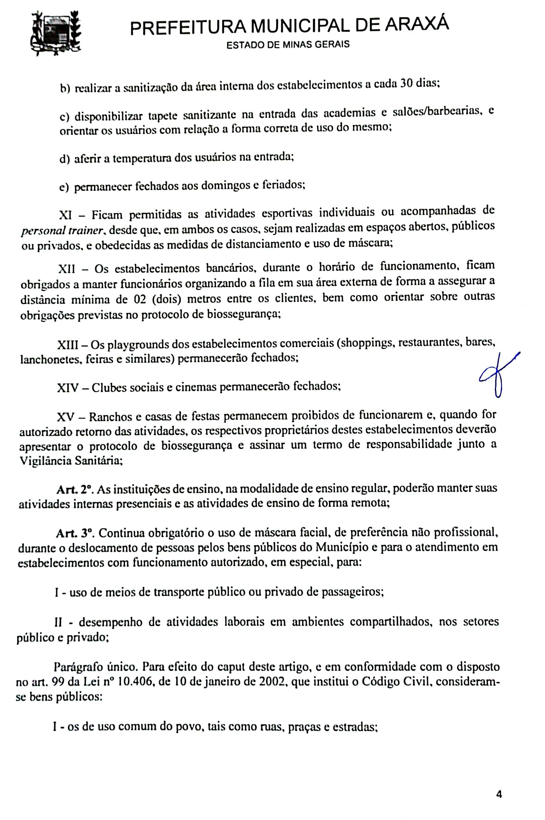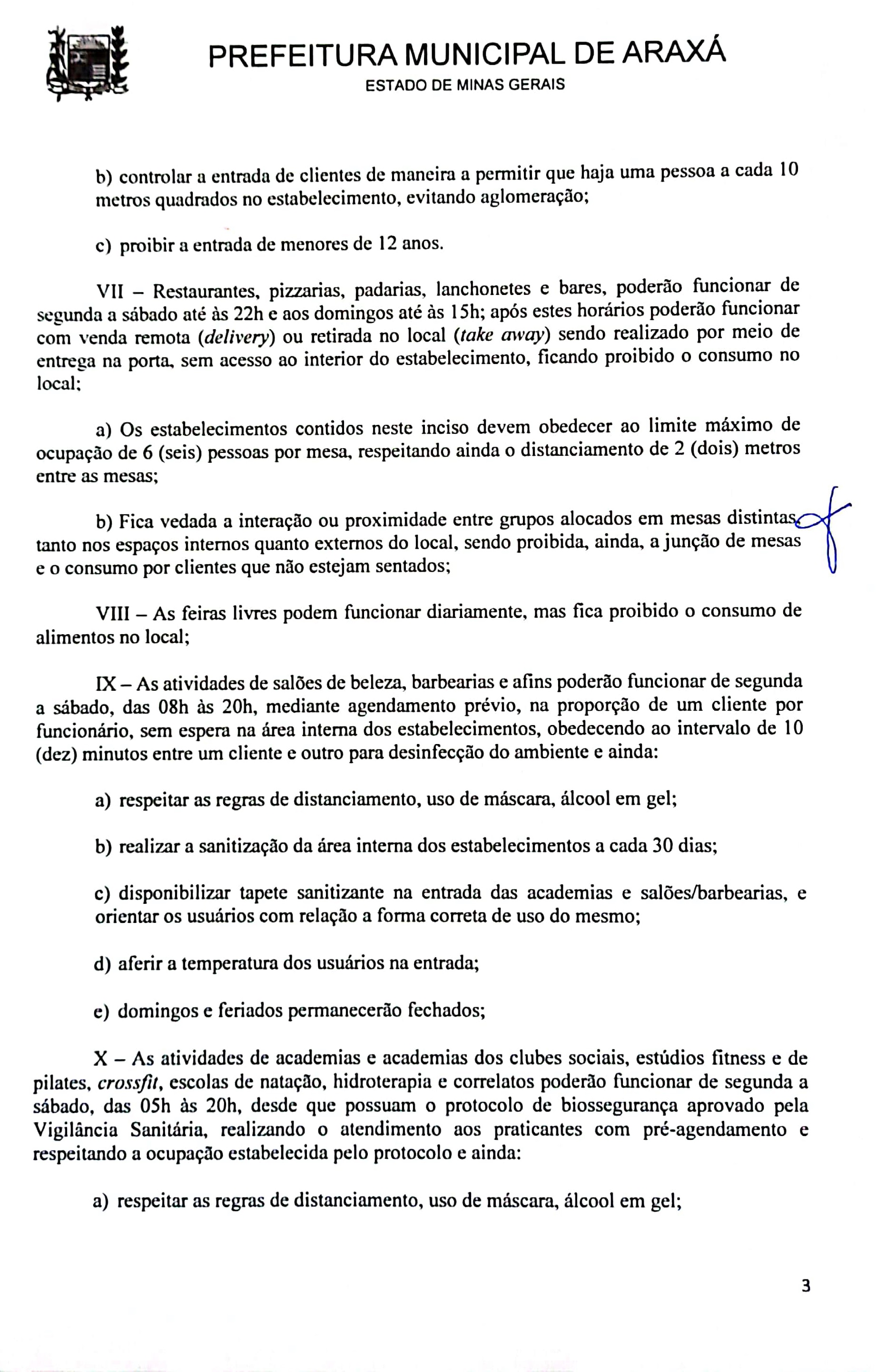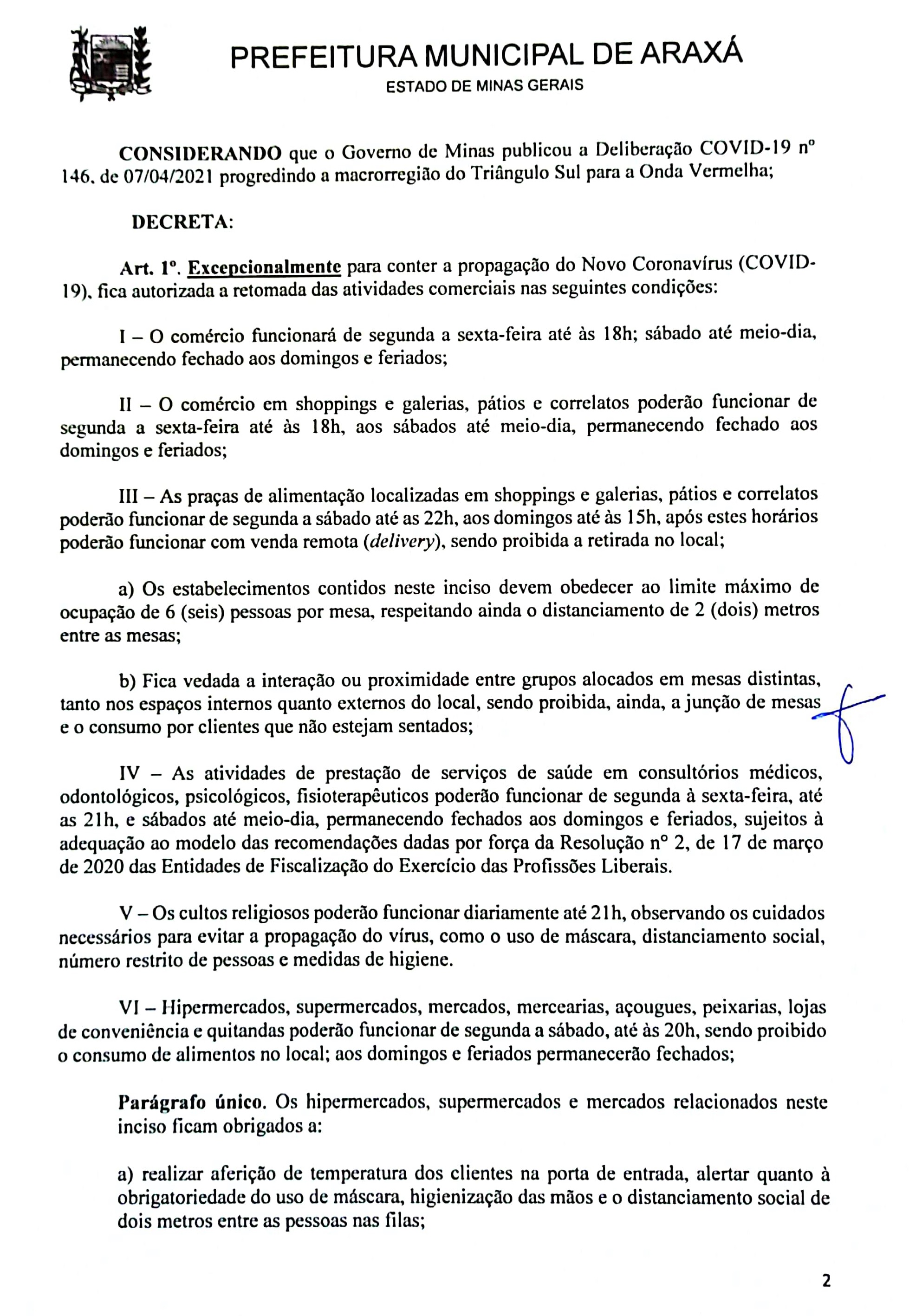 A Prefeitura Municipal de Araxá havia divulgado que apenas as atividades consideradas como essenciais poderiam funcionar a partir de segunda-feira (12). Posteriormente publicou com alterações o novo Decreto que, passou a permitir o funcionamento do comércio em geral de segunda à sexta-feira até às 18h e aos sábados até às 12h.