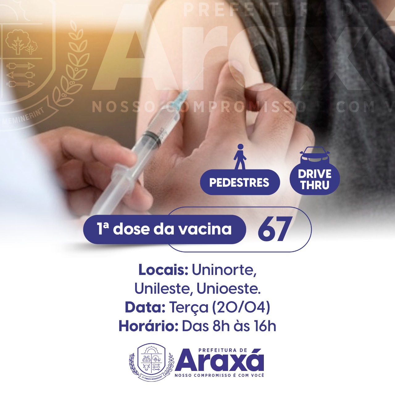 A Prefeitura de Araxá promove a vacinação contra Covid-19 de idosos de 67 anos nesta terça-feira (20). A imunização acontece na Unileste, Uninorte e Unioeste, das 8h às 16h. Serão formadas duas filas para que as pessoas possam receber a dose da vacina, uma para o formato drive-thru e outra para pedestres.