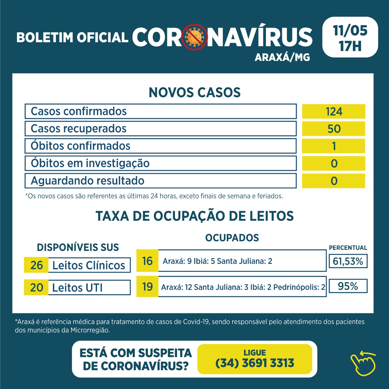 Araxá registrou nada menos que 124 novos casos positivos de Covid-19 nas últimas 24h. O número representa um dos maiores índices de contagio registrados em um só dia na cidade. Ao longo da pandemia Araxá totaliza 9.335 casos da doença e 144 óbitos confirmados.